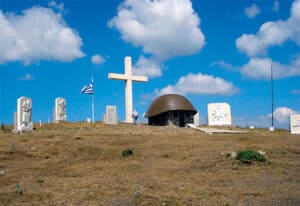 Στή σκιά τοῦ σταυροῦ ἐπιβλητικό ὁμοίωμα στρατιωτικοῦ κράνους ἀναπαύει τά ὀστά τῶν ἀγωνιστῶν, πού σπάρθηκαν στίς κορυφογραμμές, γιά νά φυτρώσει ἡ λευτεριά. Ἡ ὅλη σύνθεση* πλημμυρίζει τίς καρδιές μέ δέος, συγκίνηση καί ἐθνική περηφάνια, ὑπομνηματίζοντας ἔτσι στή λεωφόρο τῆς μνήμης τό χρέος ὅλων μας ἀπέναντι στήν ἱστορία: «Μή, παρακαλῶ σας, μή λησμονᾶτε τή χώρα μου!».